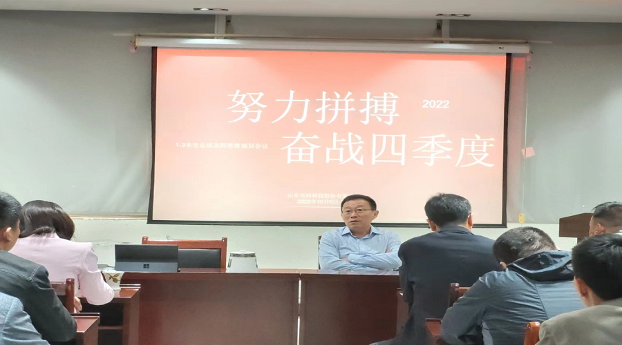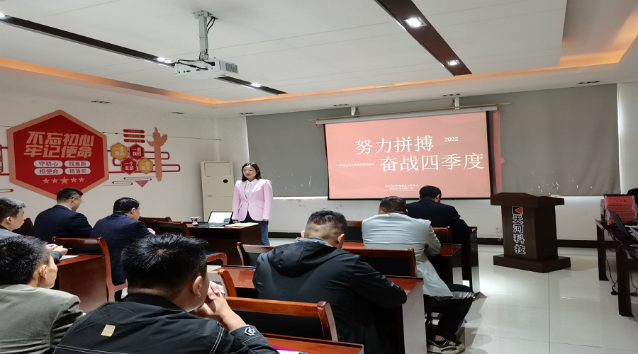 10月6日-7日,天河科技召開2022年三季度營銷會議,全面總結前三季度銷售工作,安排部署下步工作,動員全體銷售人員明確目標,堅定信心,努力拼搏,奮戰四季度,為完成全年任務目標而全力沖刺。董事長、總經理田勝利,副總經理劉慧珍,銷售副總王勇、楊仲芹出席會議,銷售部相關人員參加會議。會議由銷售副總楊仲芹主持。