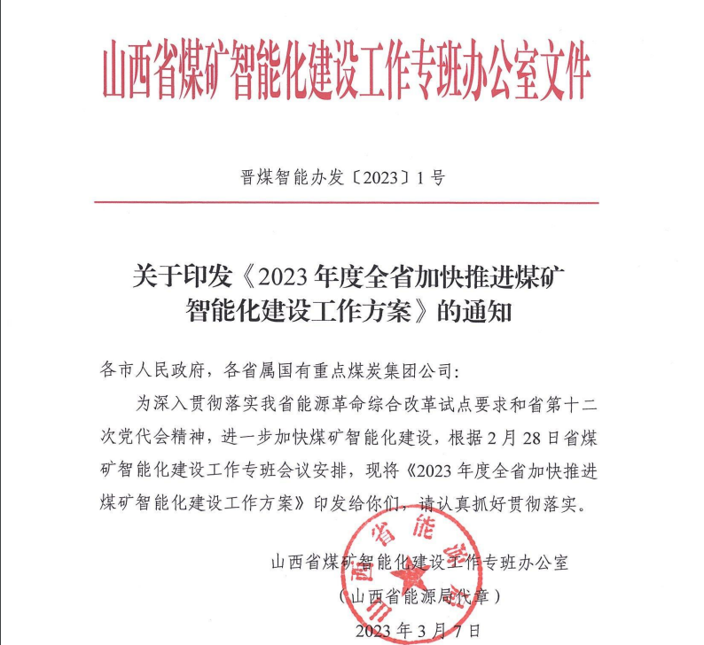 2023年3月,山西省印發《2023年度全省加快推進煤礦智能化建設工作方案》,方案明確,2023年,180萬噸/年及以上生產煤礦智能化改造全部開工,確保建成智能化煤礦80座,力爭建成90座;大型和災害嚴重煤礦智能化采掘工作面改造全部開工,上年度未建成的智能化采掘工作面全部建成,確保建成智能化工作面300處,力爭建成470處。持續推動煤礦開展5G場景應用,全面推進煤礦固定場所無人值守,關鍵環節機器人替代。