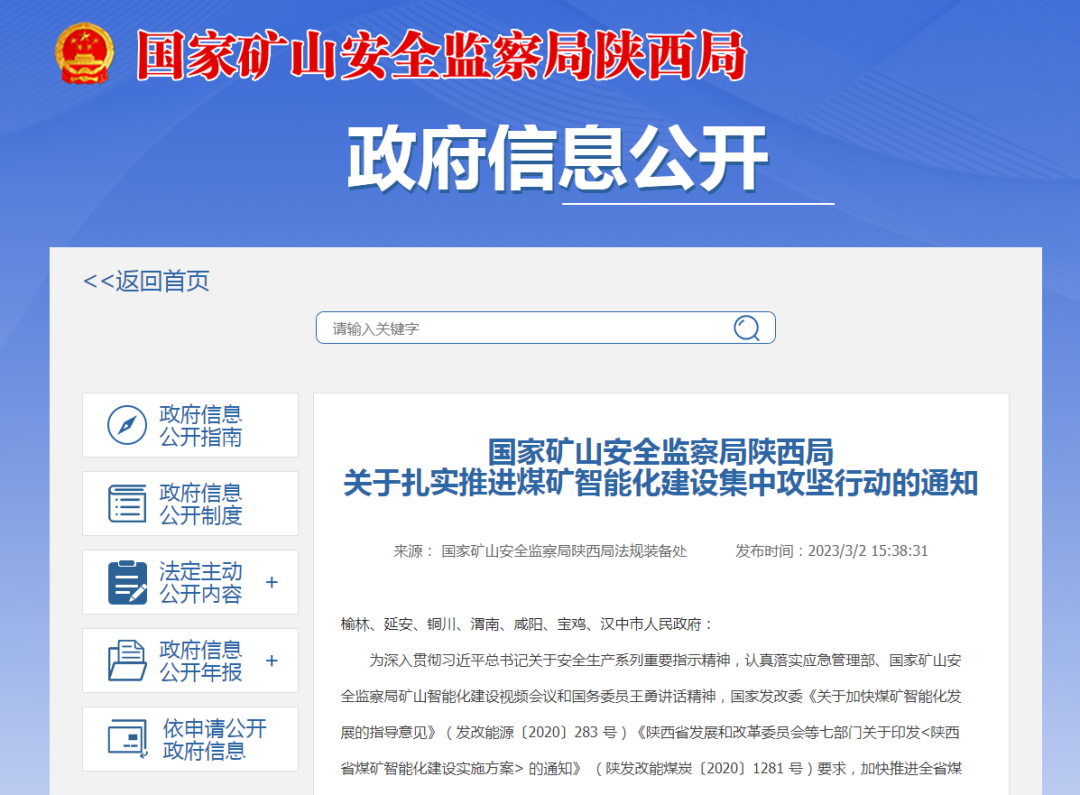2023年3月陜西省印發《關于扎實推進煤礦智能化建設集中攻堅行動的通知》,提出2023年陜西省煤礦智能化建設總體目標任務,全省災害嚴重礦井、生產能力120萬噸/年及以上煤礦、咸陽市所屬生產能力90萬噸/年及以上礦井應全部實現智能化建設;新建、技改煤礦應同步完成智能化礦井建設;采煤和掘進工作面、生產輔助系統均應實現智能化運行,高危固定崗位實現無人值守和遠程監控。