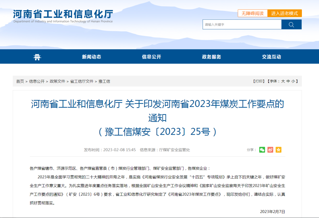 2023年2月,河南省工業和信息化廳印發《河南省2023年煤炭工作要點》,其中提出全力推動煤礦智能化建設高質量發展。加大資金投入,強化智力支持,按期完成8處省級智能化煤礦、29個智能化采煤工作面、114個智能化掘進工作面的年度建設任務,確保三年行動圓滿收官。