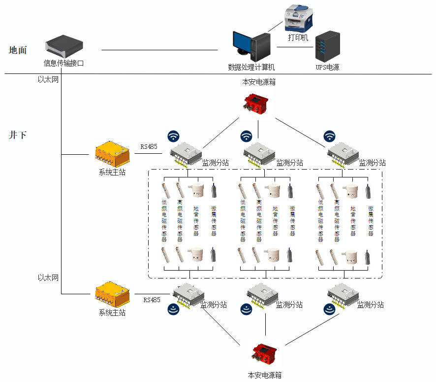 KJ1235煤礦用沖擊地壓監測系統主要包括KJ1235在線監測主站、KJ1235-F數據監測分站、高頻電磁輻射天線、低頻電磁輻射天線、聲發射傳感器、拾震傳感器、KJJ220信息傳輸接口、數據采集器等。